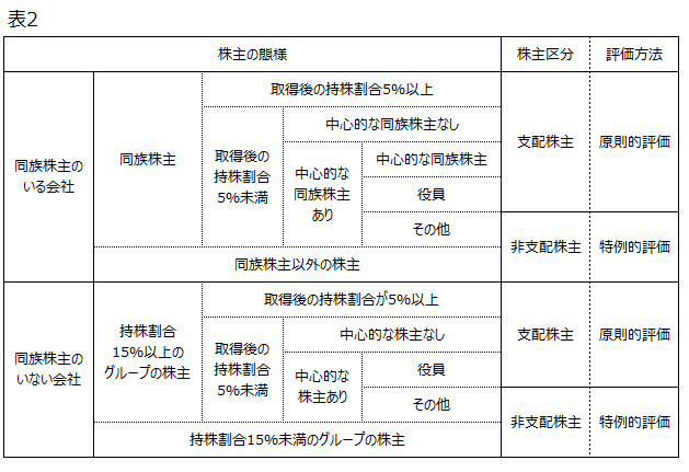 株主を持株比率などにより「支配株主」と「非支配株主」に区分し、支配株主には「原則的評価」を、非支配的株主には「特例的評価」を適用することになる。ただし、特例的評価が原則的評価を上回る場合には原則的評価が適用される。